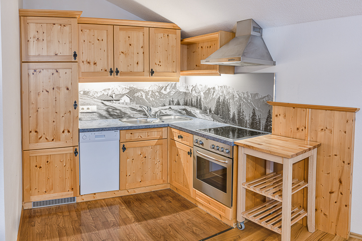 Das Wohnzimmer wurde vom Schreiner mit Zirbenholz ausgebaut.